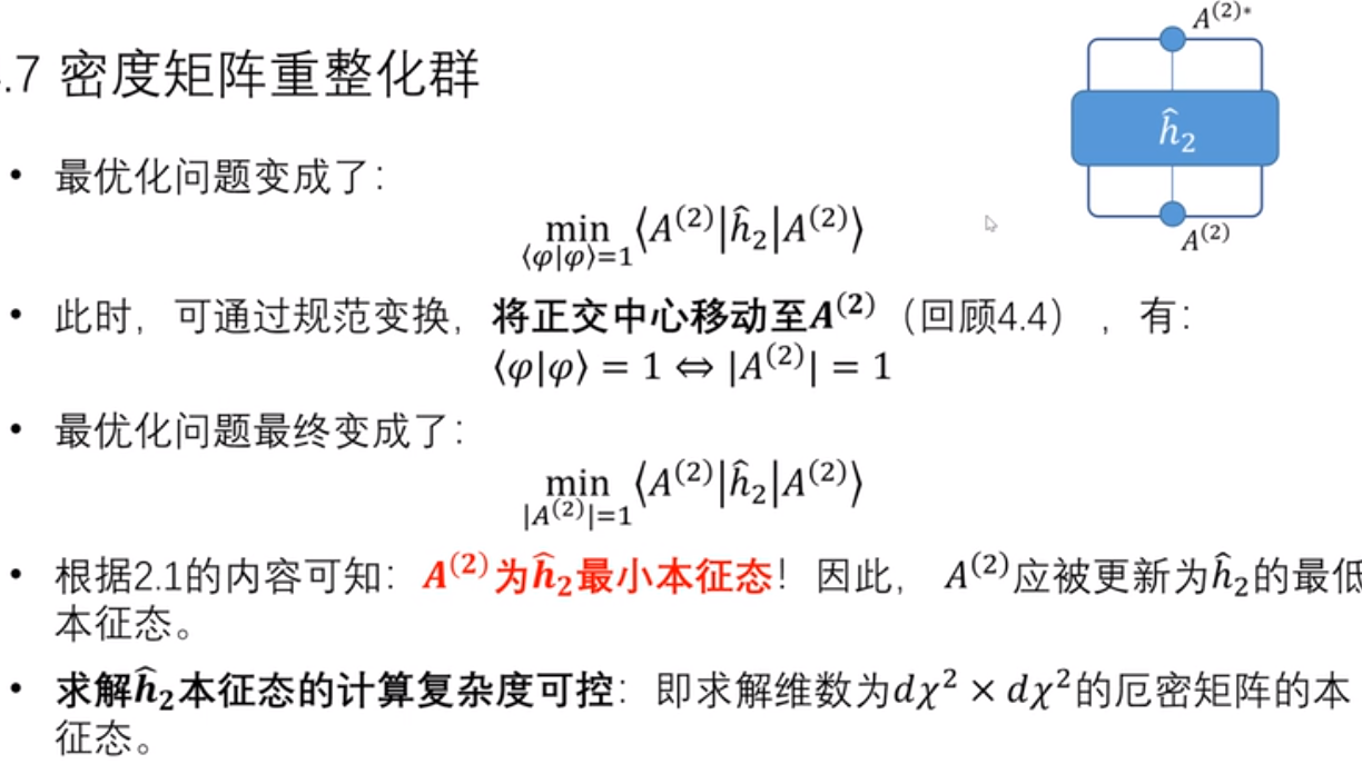 ALS的方法),故需要反复的迭代更新A1,A2….各个张量,这个地方一般迭代50多次就可以收敛了,计算复杂度线性增加,不会出现指数爆炸问题。同时在计算过程中,可以通过移动正交中心简化计算。