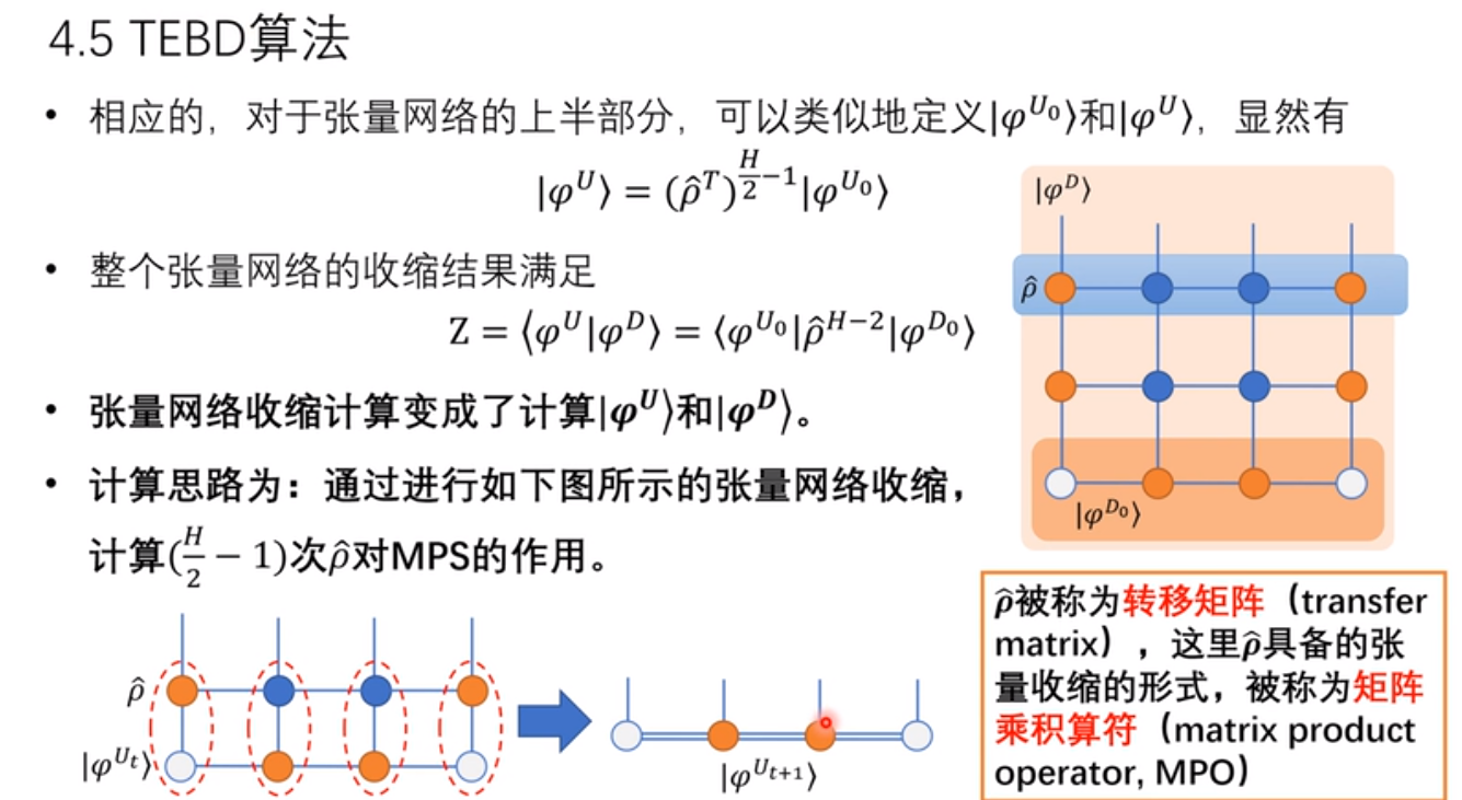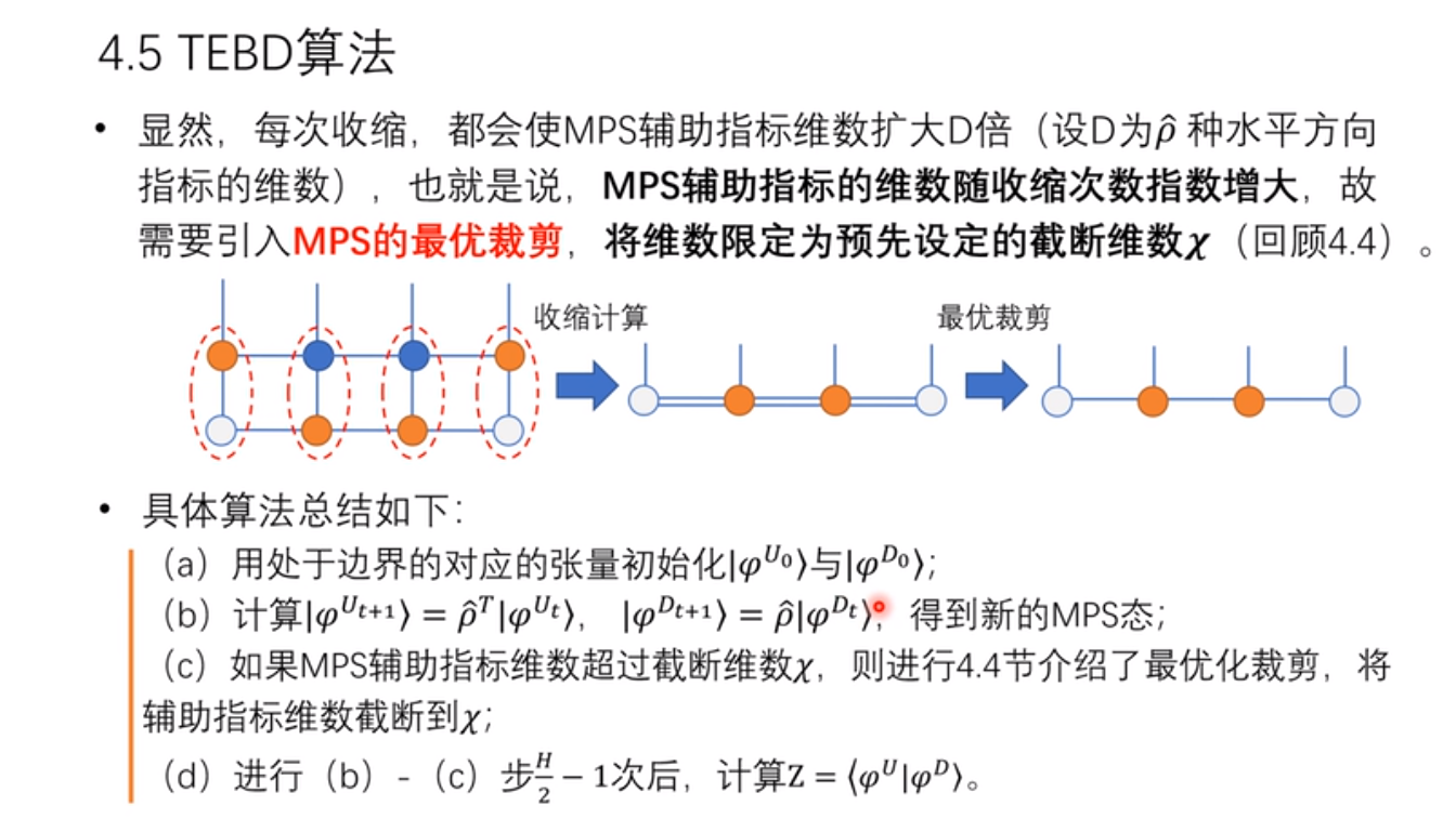 对于一个W*H的张量网络,在规定求和的顺序后可以将它严格求出。当W或H比较大的时候,这个张量网络的复杂度就呈指数级别增长,传统计算机不能在有效时间内给出结果。而TEBD就是一种基于矩阵乘积态的、近似收缩张量网络的数值算法。