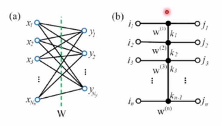 神经网络结构和张量网络的对应,请看下图,张量网络毫无压力的可以表示多层神经网络结构!通过对MPS态的进一步优化就可以实现对网络结构的优化,这种方式极大的减少了神经网络的权重参数