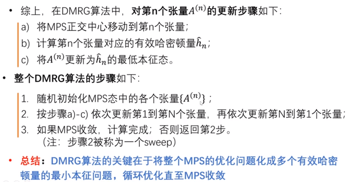 DMRG的策略是更新各个张量,使能量达到极小,具体的更新策略不唯一。在单点(one-site)DMRG中,每次更新MPS中的一个张量,其余张量看成是给定的参数。单个张量的优化问题可以等价为局域矩阵的最大本征值问题。