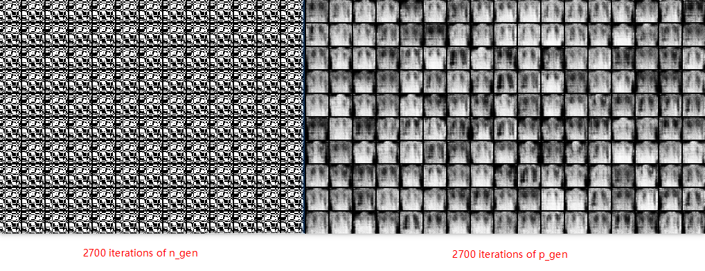 在实验过程中还经常遇到另一类问题,那就是负样本的生成模型总是无法学习到真实样本的概率分布。如下图所示,图左为迭代了2700次的负样本生成器 (n_gen),图右为迭代了2700次的正样本生成器 (p_gen)。明显看到正样本生成器的生成效果还算不错,可是负样本没有学习到样本的概率分布,也就是出现了不收敛的情况。
